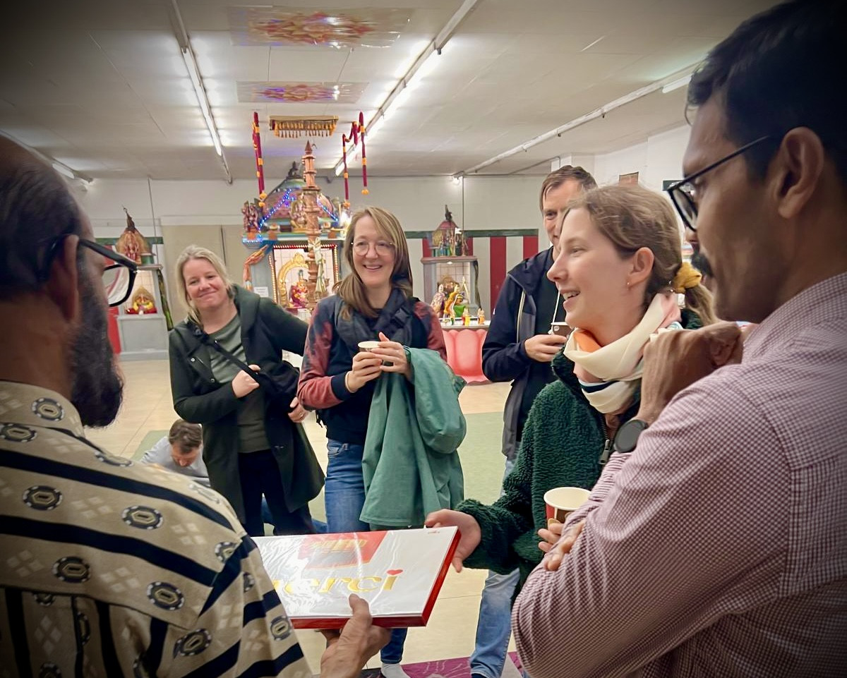 Die Vorstände des Tempels begrüßten die Gäste herzlich und erzählten von der tamilisch-hinduistischen Gemeinschaft, ihrem Glaubensleben und ihren Festen. Auch hier spielte das gemeinsame Essen eine Rolle: Für die Besucherinnen und Besucher gab es ein süßes, gedämpftes Gebäck, das mit Kokos und Kardamom gefüllt ist, sowie Chai.