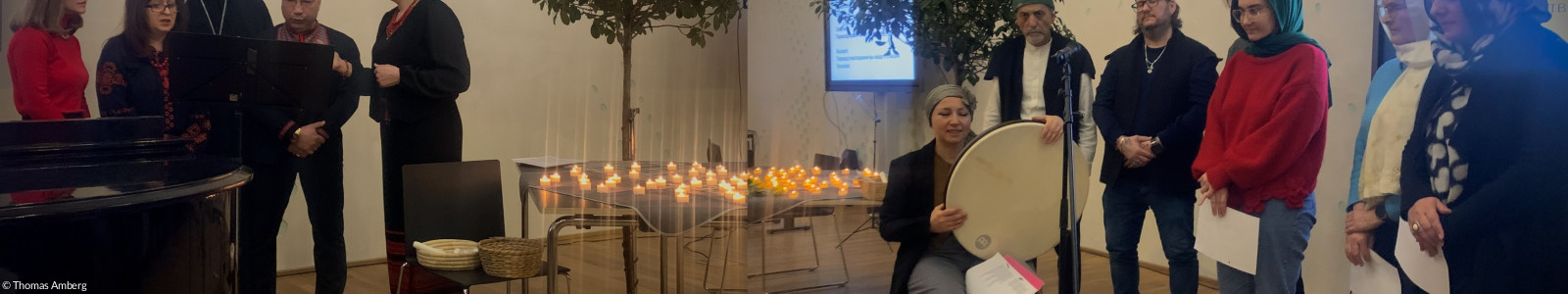 Was schließlich am 24.02.2026 von vielen der Teilnehmenden, den Vorbereitenden und mitfeiernden Besuchern als enorm dicht und stimmig erlebt wurde, war bei aller Vorbereitung doch auch ein Stück weiter unverfügbar und geschenkt: Klagegebete, Totengedenken mit einem Lichterritual, jüdische, christliche, muslimische Klagelieder aus der Breite der jeweiligen Traditionen, ein buddhistisches Atemlied; … mit den gesungenen Worten aus dem Friedensgebet des Franz von Assisi („O Signore fa di me uno Instrumento della tua Pace“) zogen die Singenden des Projektchors schließlich aus dem Saal hinaus in den Raum der Stadt.