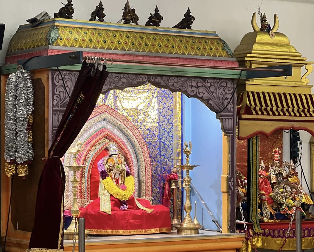 Die nächste Station führte in die Humboldtstraße zum Sri Sithivinayagar Tempel. Schon beim Eintreten empfing die Gruppe ein Gewürzduft und der Anblick farbenprächtiger Götterfiguren, unter ihnen Ganesha und Vishnu.