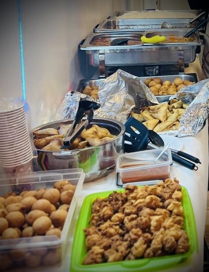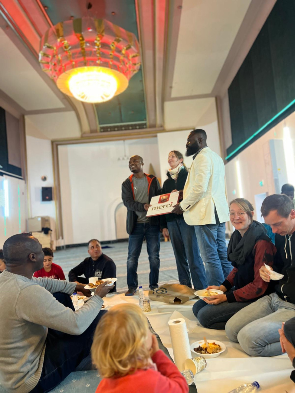 Danach luden die Frauen der Gemeinde zu einem üppigen Buffet mit verschiedenen afrikanischen Köstlichkeiten ein – darunter Samosas, aromatische Eintöpfe und würzige Reisgerichte. In der muslimischen Tradition gilt: Je mehr gegessen wird, desto mehr Segen empfängt der Gastgeber – und so wurde mit Freude, Neugier und Offenheit miteinander gegessen und gesprochen.