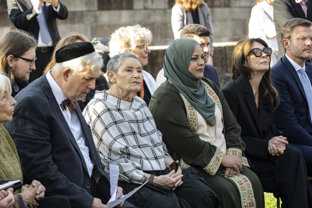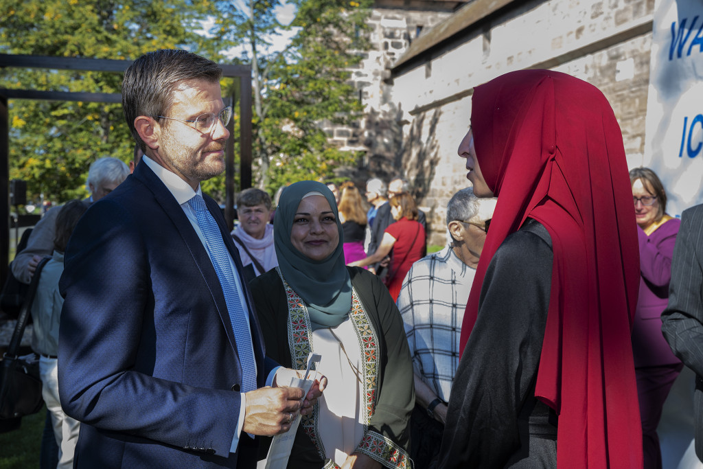 Verleihung des Nürnberger Menschenrechtspreises: beim Friedensgebet am KUBUS der Religionen wird die große Tüte aufgestellt. Auf den Tischen der Friedenstafel stehen viele hundert kleine Tüten und laden zum Nachdenken ein.